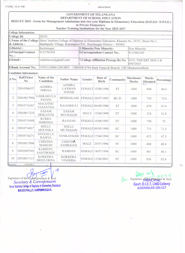 The SHREE VASHISTA B.Ed , D.El.Ed College is located at Vill : Baddipally,Mdl : Kothapally , Distric : Karimnagar ( Towards Sircila & Vemulawada Road)